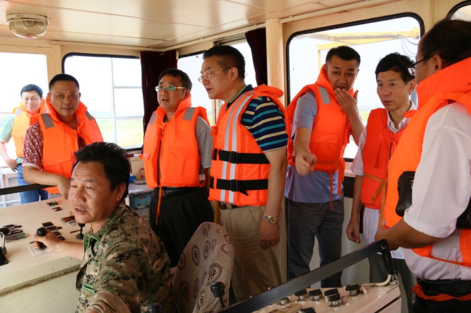 在交通艇上,劉總認(rèn)真聽取了安徽交航青弋江疏浚項(xiàng)目的詳細(xì)介紹,了解了施工進(jìn)度和下一步施工計(jì)劃。登船后與船員們一一握手、親切交談,詢問他們生活飲食情況、防暑降溫措施,隨后登上船舶操作室,詳細(xì)了解挖泥船施工技術(shù),通過GPS定位觀察位于水下的施工作業(yè)面積。劉總囑咐船員們?cè)诖献鳂I(yè)要注意安全,在酷暑天氣保障生產(chǎn)進(jìn)度的同時(shí)切實(shí)做好防暑降溫工作,確保健康防暑、平安防暑。